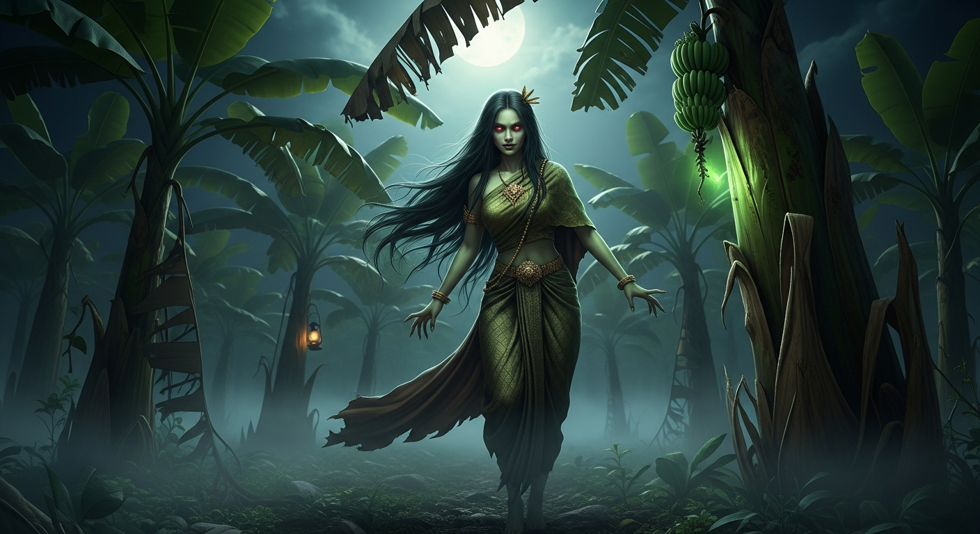 ผมพยายามรวบรวมความกล้า ค่อยๆ เดินไปที่หน้าต่างนั้น ชะโงกหน้าออกไปมองอย่างระมัดระวัง สายฝนยังคงโปรยปรายลงมาไม่ขาดสาย แสงจันทร์ถูกบดบังด้วยหมู่เมฆดำทะมึน ทำให้มองเห็นอะไรไม่ชัดนัก แต่แล้ว... ในความมืดสลัวใต้ต้นกล้วยตานี ผมเห็นเงาของผู้หญิงคนหนึ่ง เธอยืนนิ่งอยู่ตรงนั้น ผมมองไม่เห็นใบหน้าเธอชัดเจน แต่เธอสวมชุดไทยสีเขียวเข้มเหมือนสีใบตอง สไบพาดไหล่ เธอกำลังก้มลงไปทำอะไรบางอย่างที่โคนต้นกล้วย มือของเธอขาวซีดและเรียวยาว ผมเห็นเธอค่อยๆ เงยหน้าขึ้นช้าๆ