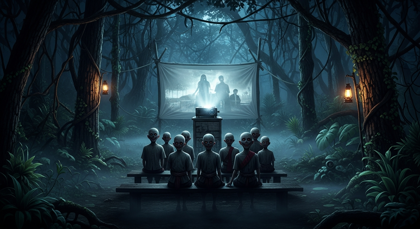 ระหว่างที่กำลังจัดเตรียม จู่ๆ ผู้คนก็เริ่มทยอยกันมาครับ พวกเขาโผล่มาจากความมืดมิดรอบๆ ตัวศาลา เหมือนเงาที่ลอยออกมาจากผืนดิน ไม่มีเสียงพูดคุย ไม่มีเสียงเท้า ไม่มีแม้แต่เสียงกระแอมไอ ทุกคนแต่งกายด้วยชุดไทยโบราณเหมือนกันหมด สีสันเก่าซีด บางคนเป็นผ้าคราม บางคนเป็นผ้าฝ้ายทอมือ ผมเผ้ายาวรุงรัง ไม่ได้หวี ดวงตาของพวกเขาแต่ละคนจ้องมาที่จอหนังด้วยแววตาว่างเปล่าไร้อารมณ์ แต่แฝงด้วยความกระหายบางอย่างที่ผมอธิบายไม่ถูก ผมกะประมาณด้วยสายตา น่าจะมีไม่ต่ำกว่าร้อยคน แต่กลับเงียบสนิทจนได้ยินเสียงลมพัดใบไม้เสียดสีกันเบาๆ