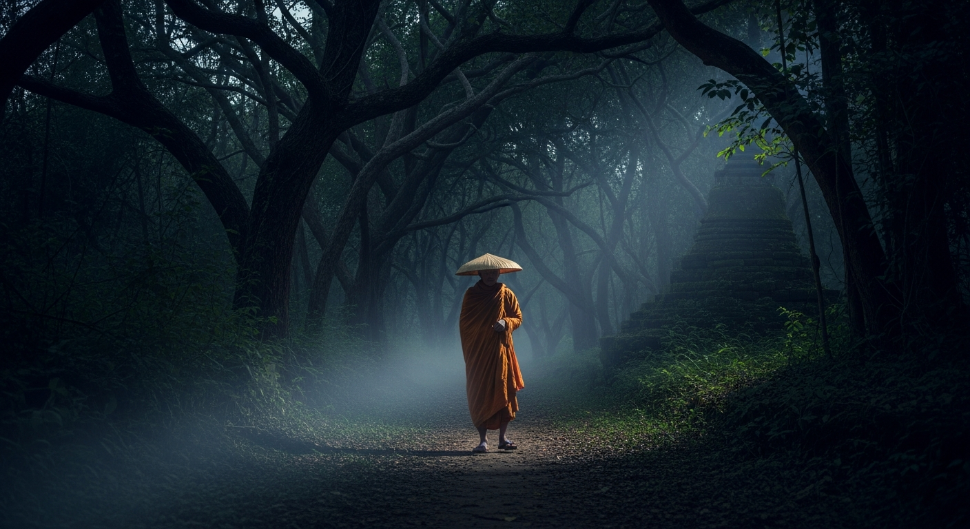 คืนแรก ผมนั่งสมาธิในกุฏิครับ ได้ยินเสียงลมพัดใบไม้เสียดสีกันดังครืดคราดตลอดเวลา เหมือนมันมีจังหวะผิดปกติไปบ้าง แต่ผมก็พยายามคิดว่าคงเป็นเสียงธรรมชาติแหละ พอจะเคลิ้มหลับไป เสียงเหมือนมีคนเดินลากเท้าบนใบไม้แห้งหน้ากุฏิก็ดังขึ้นมาครับ แคร่กๆ แคร่กๆ ผมลืมตาขึ้นมามองลอดช่องหน้าต่าง แต่มันมืดสนิทจนมองไม่เห็นอะไร ใจก็เริ่มเต้นตุบๆ แต่ก็ปลอบตัวเองว่าคงเป็นสัตว์ป่า หรือไม่ก็พระสงฆ์เดินจงกรม